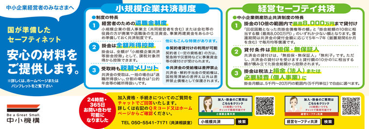 小規模企業共済や中小企業倒産防止共済(経営セーフティ共済)を2025年内に新規加入し、今年の必要経費(損金)に算入を考えている方は、当所では12月24日(水)を締切とします。年内に経費算入(損金算入)の前納をお考えの方は小規模企業共済は現金の納付のみ、倒産防止共済は振込のみになりますのでご注意ください。