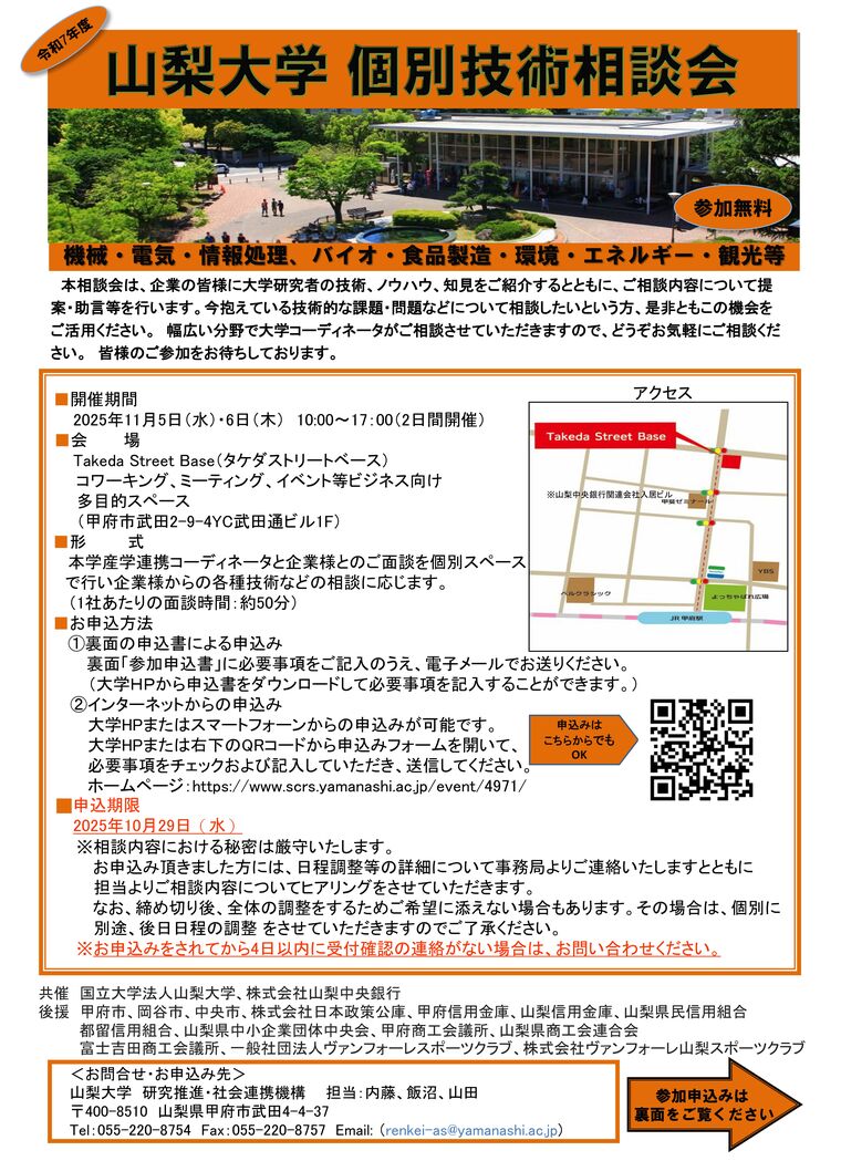 日 時 2025年11月5日(水)・6日(木) 10:00~17:00 場 所 Takeda Street Base(甲府市武田2-9-4 YC武田通ビル1F) 相談対象 産学連携全般