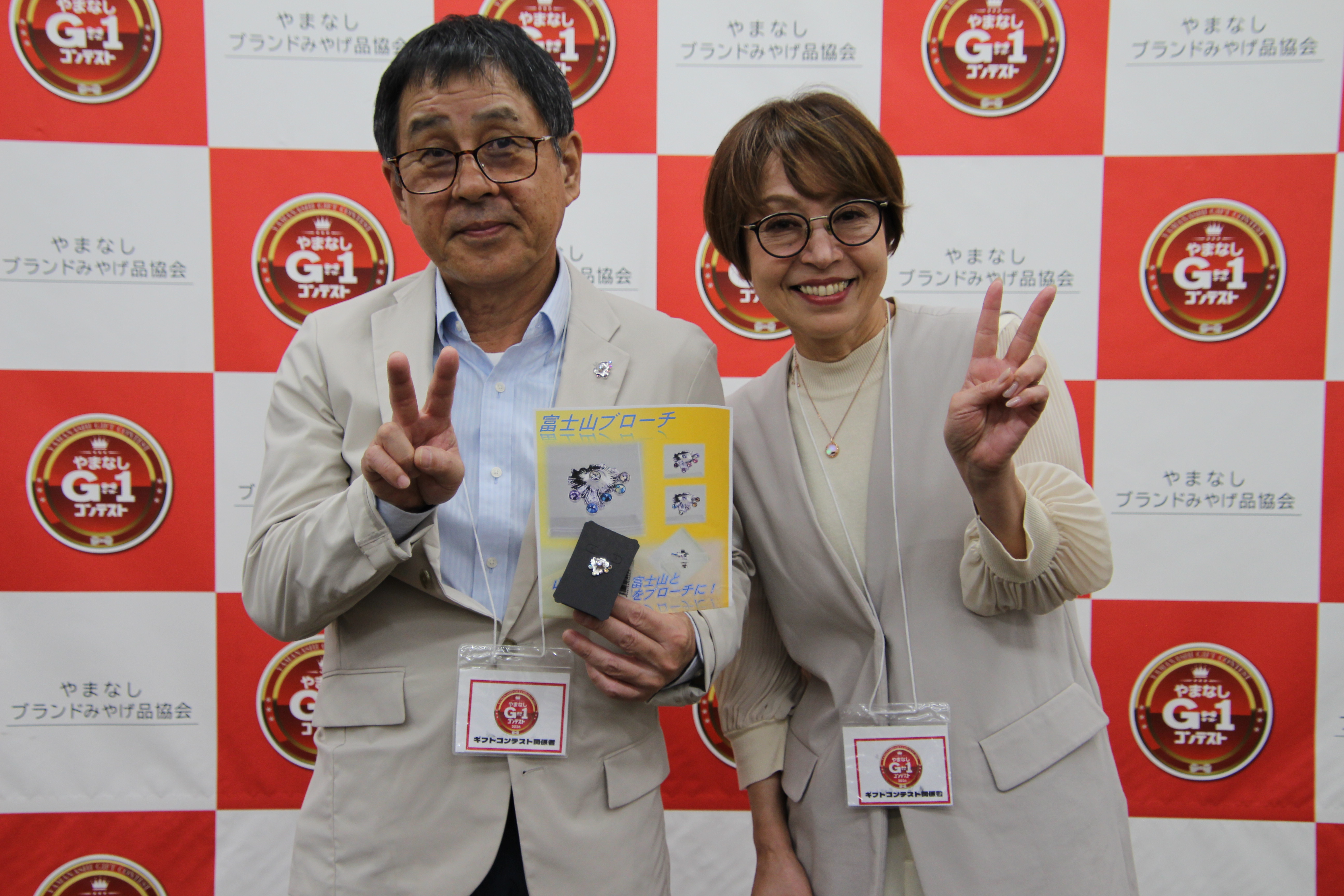 山梨県笛吹市石和町東油川124-3商品内容 山梨県と富士山と富士五湖をビンブローチに、日々変わる湖の風景をガラスで表現いたしました。 価格 2,750円 コンテストの様子(左上:【食品最優秀賞】おうちほうとう(割烹立よし株式会社)、右上:【非食品優秀賞】富士山ブローチ(有限会社ミツワ))