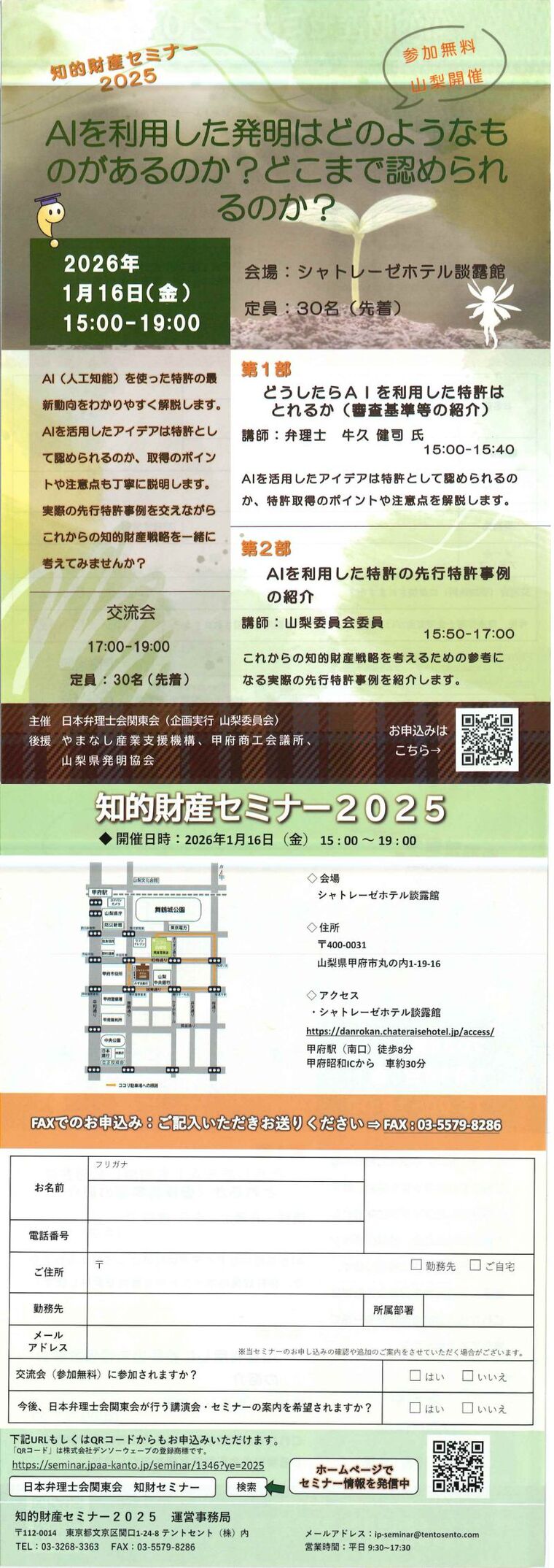 講師:弁理士会 山梨委員会委員参 加 費 無料 参加方法 チラシ記載のQRコードを読み込み専用フォームよりお申込ください。 主 催 日本弁理士会 関東会 問合せ先 知的財産セミナー2025運営事務局、日本弁理士会関東会(山梨委員会)