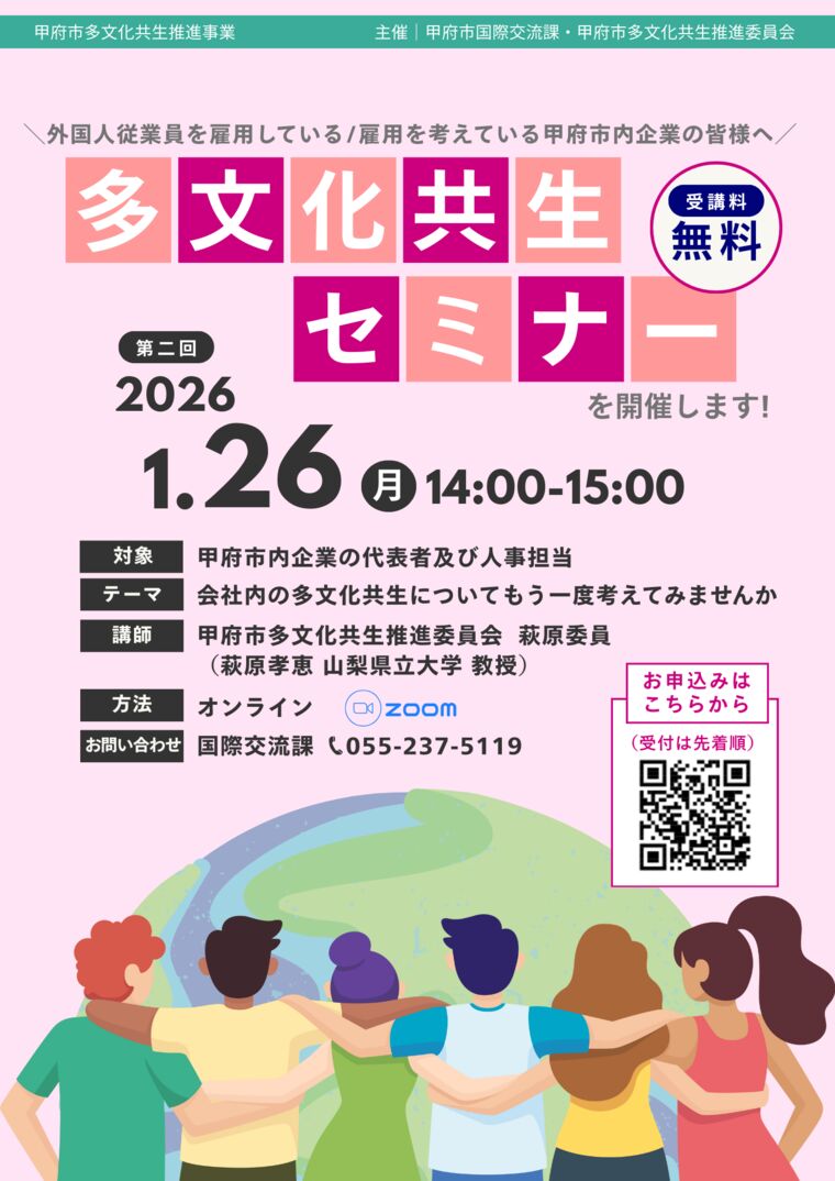 甲府市内企業の代表者及び人事担当の皆様を対象に、企業内の多文化共生について考えるセミナーを開催します。多様な文化を持つ方々との関わり方を学びながら多文化共生への理解を深めます。是非ご参加ください。