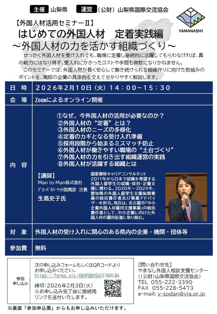 このセミナーでは、外国人材が長く安心して働き続けられる組織作りに向けた取組みのポイントを、実際の企業の具体例を交えて分かりやすく解説します。日時 2026年2月10日(火)14時00分~15時30分 会場 Zoomによるオンライン開催 対象 外国人材の受け入れに関心のある県内の企業・機関・団体等 参加費 無料 申込方法 下記参加申し込みフォームからお申込みください 〆切 2026年2月3日(火)まで 問合せ先 やまなし外国人相談支援センター((公財)山梨県国際交流協会)