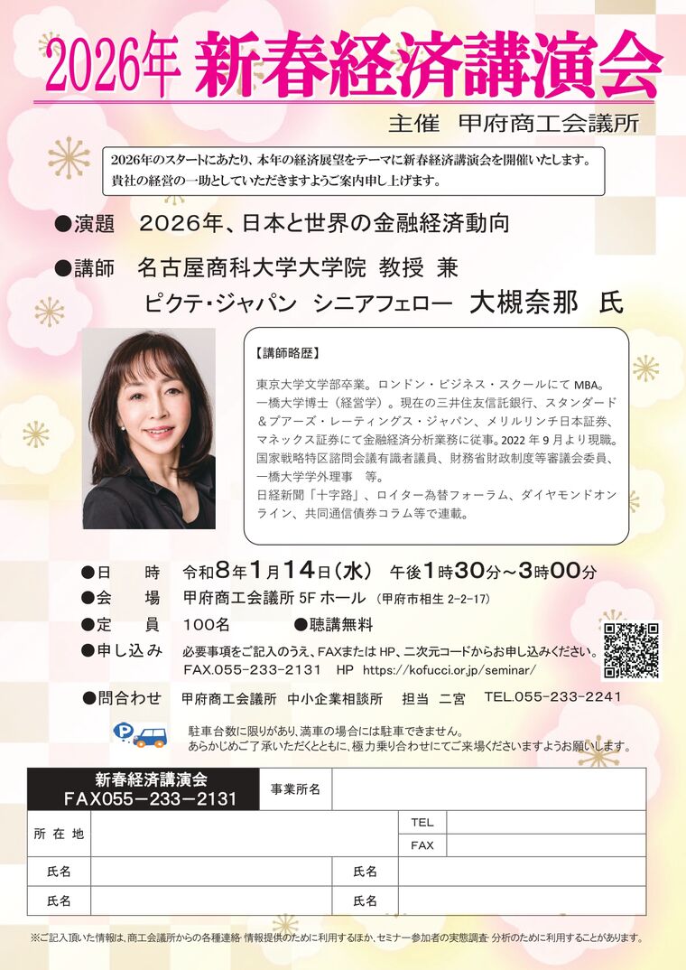 2026年のスタートにあたり、本年の経済展望をテーマに新春経済講演会を開催いたします。貴社の経営の一助としていただきますようご案内申し上げます。
