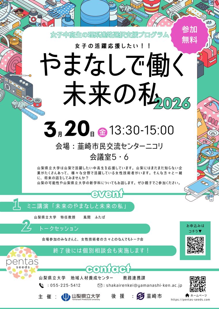 日 時 2026年3月20日(金)13:30~15:00 場 所 韮崎市民交流センターニコリ 会議室5・6 テ ー マ 女子中高生の理系進路選択支援プログラム「やまなしで働く未来の私」