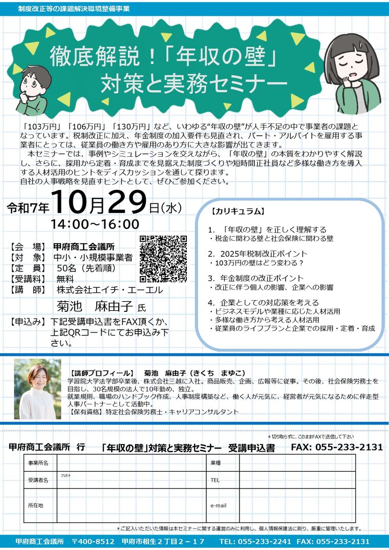 日時 2025-10-29 14:00~16:00 場所 甲府商工会議所 講師 特定社会保険労務士・キャリアコンサルタント 菊池麻由子 氏 参加費 無料 分野 労務・税務 申し込み方法 【お申込みフォーム】