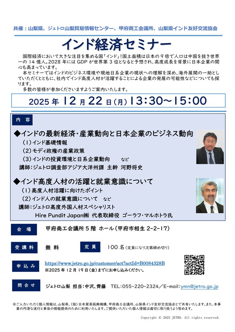 日時 2025-12-22 13:30~15:00 場所 甲府商工会議所 5階 ホール 講師 ①ジェトロ調査部アジア大洋州課 主幹 河野将史 氏