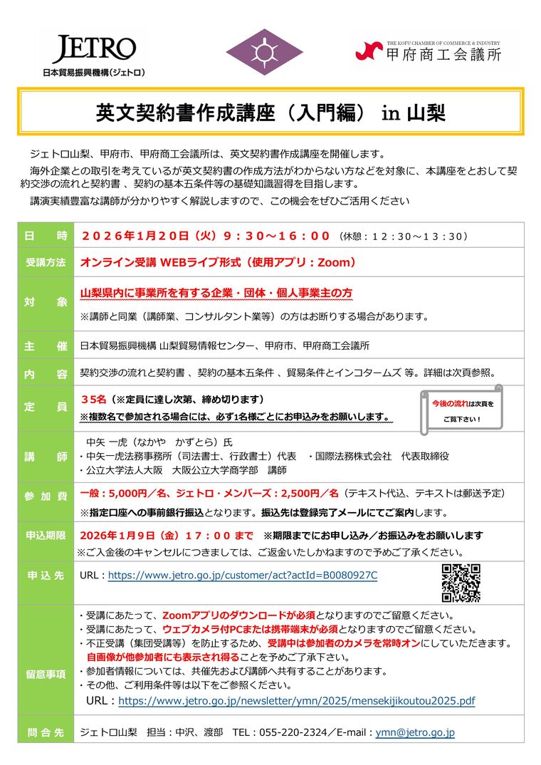 ジェトロ山梨、甲府市、甲府商工会議所は、英文契約書作成講座を開催します。