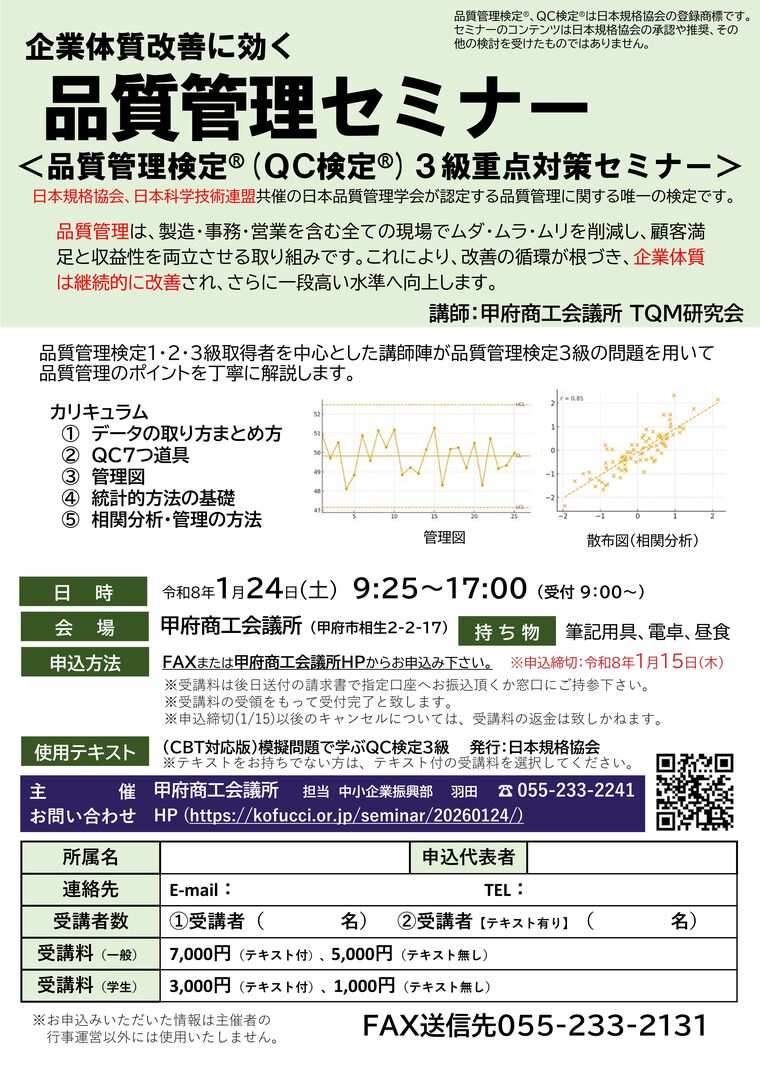 日時 2026-01-24 9:25~17:00 場所 甲府商工会議所201会議室 講師 甲府商工会議所TQM研究会 講師陣