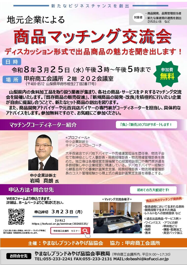 日時 2026-03-25 15:00~17:00 場所 甲府商工会議所 講師 中小企業診断士 岩崎 真朗 氏 参加費 無料 分野 マッチング 申し込み方法 【お申込みフォーム】 お問い合わせ
